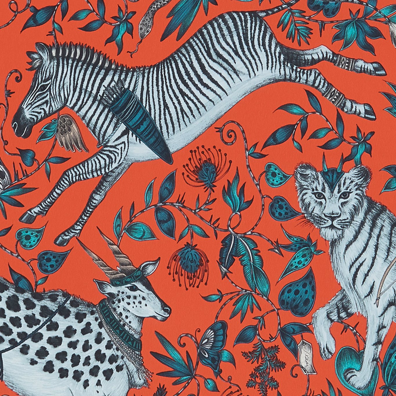 The Protea Wallpaper, made in collaboration with Emma J Shipley, is inspired by the mythology and ancient rock paintings of the indigenous San people of South Africa. This mesmerising design features curious creatures leaping through a landscape of twisting foliage, including lions, zebras, and antelopes with hunter-gatherer characteristics. The stunning animal print stands out with its intense royal blue, sky blue and grey hand-drawn details against an off-white background, highlighted beautifully with pale yellow accents. Sure to transport you to a surreal African dream world...