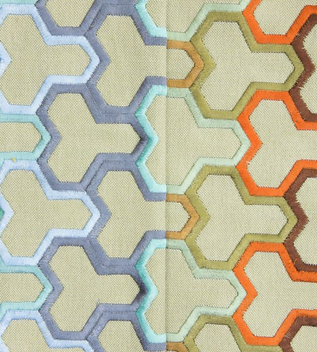 This embroidered design on a natural linen-coloured ground is based on cell structures and is reminiscent of a honeycomb. With a retro design, the intense stitching gives an almost sculptural drape.