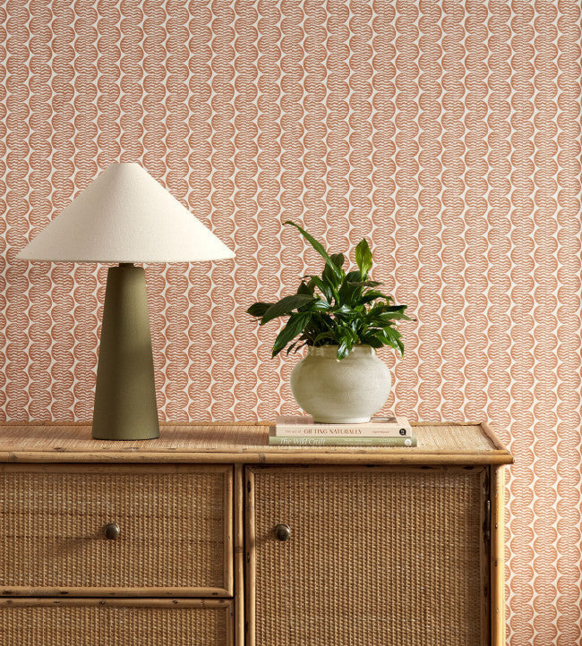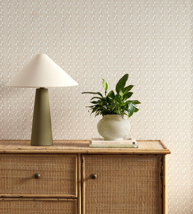 Created from a lino print, ripples of the water translate into an all-over stripe, undulating with a slightly retro feel. A stamp effect gives a charming, handcrafted feel and makes a great coordinating design.