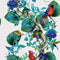 A fantastical imagining of a climbing branch of broad veined leaves and colourful blooms populated with exotic birds.