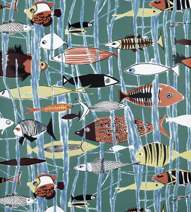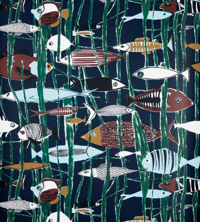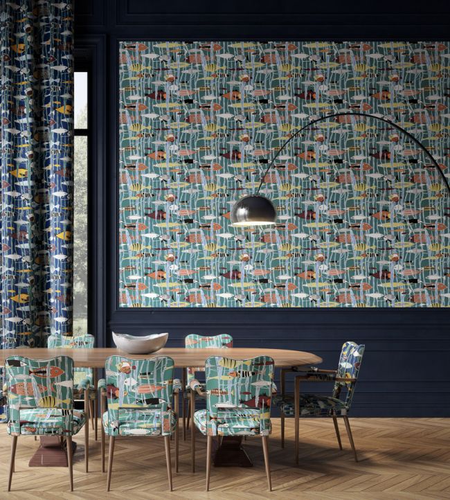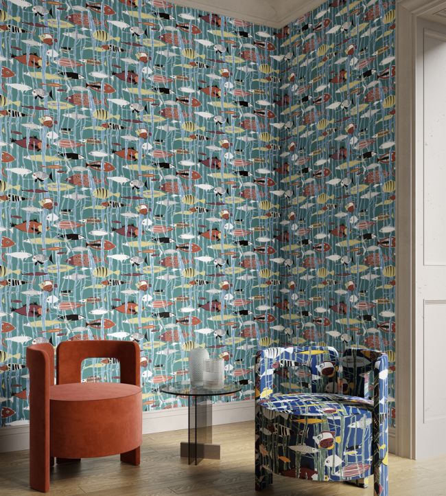 Recif is a non-woven digital print wallpaper with a matt finish. With absolute modernism, this 50s-inspired wallpaper evokes an aquarium with an all-over pattern of brightly coloured fish.