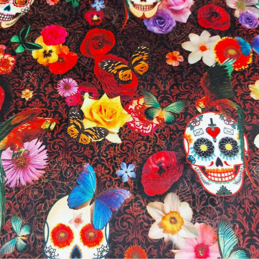 This sumptuous fabric is a bright and colourful velvet fabric. The digital print is a mix of skulls surrounded by multi-coloured flowers and butterflies. The eye catching fabric would be perfect for Halloween, making stunning cushion covers or dresses.