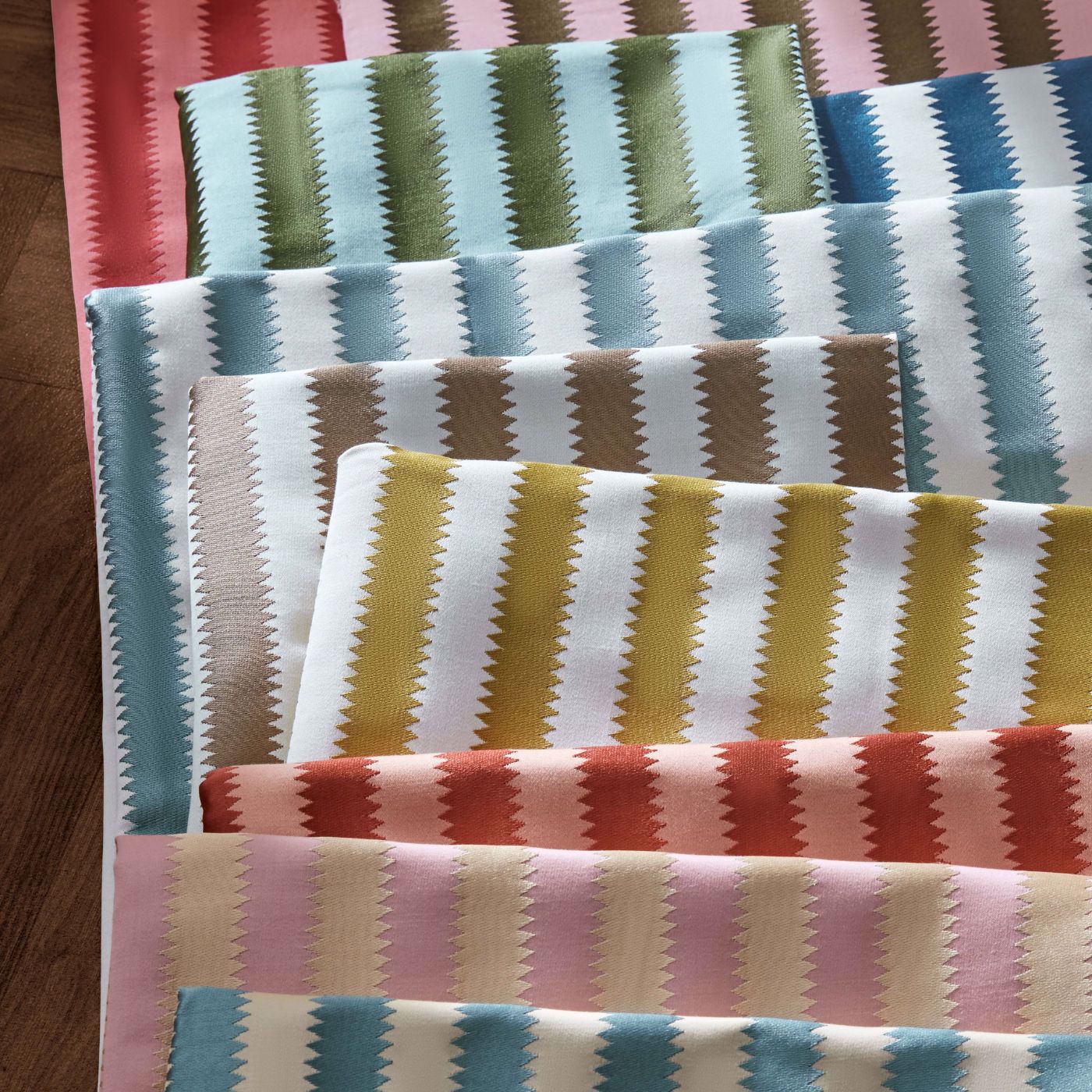 In a celebration of the sartorial stripe, together with the frivolity of the sawtooth, Giles's design for Regency Aperigon takes the Ancient Greek meaning of the name 'Apeirogon' 'infinite polygon' and runs with it, in vertical form. This design expresses a love for infinite possibilities in design and plays on the classic Sanderson stripes, respecting the classical resonance of stripes in interiors and rediscovering its power through Ancient Greek geometry. Tightly woven with a satin sheen to heighten its elegance, Regency Aperigon is a narrow stripe, reminiscent of a silk, yet perfectly suited to upholstery.
