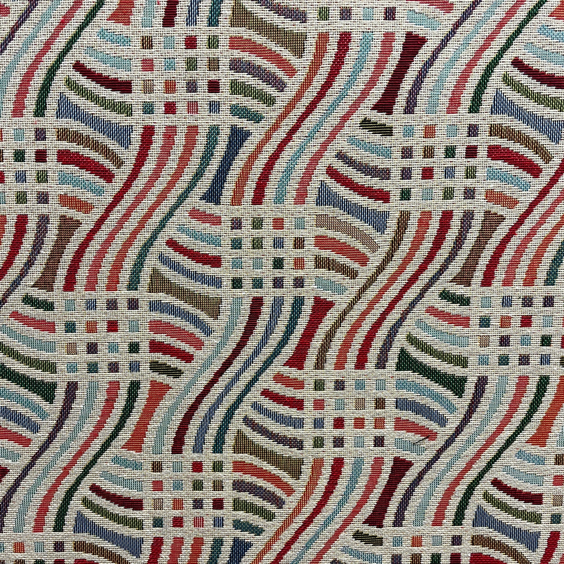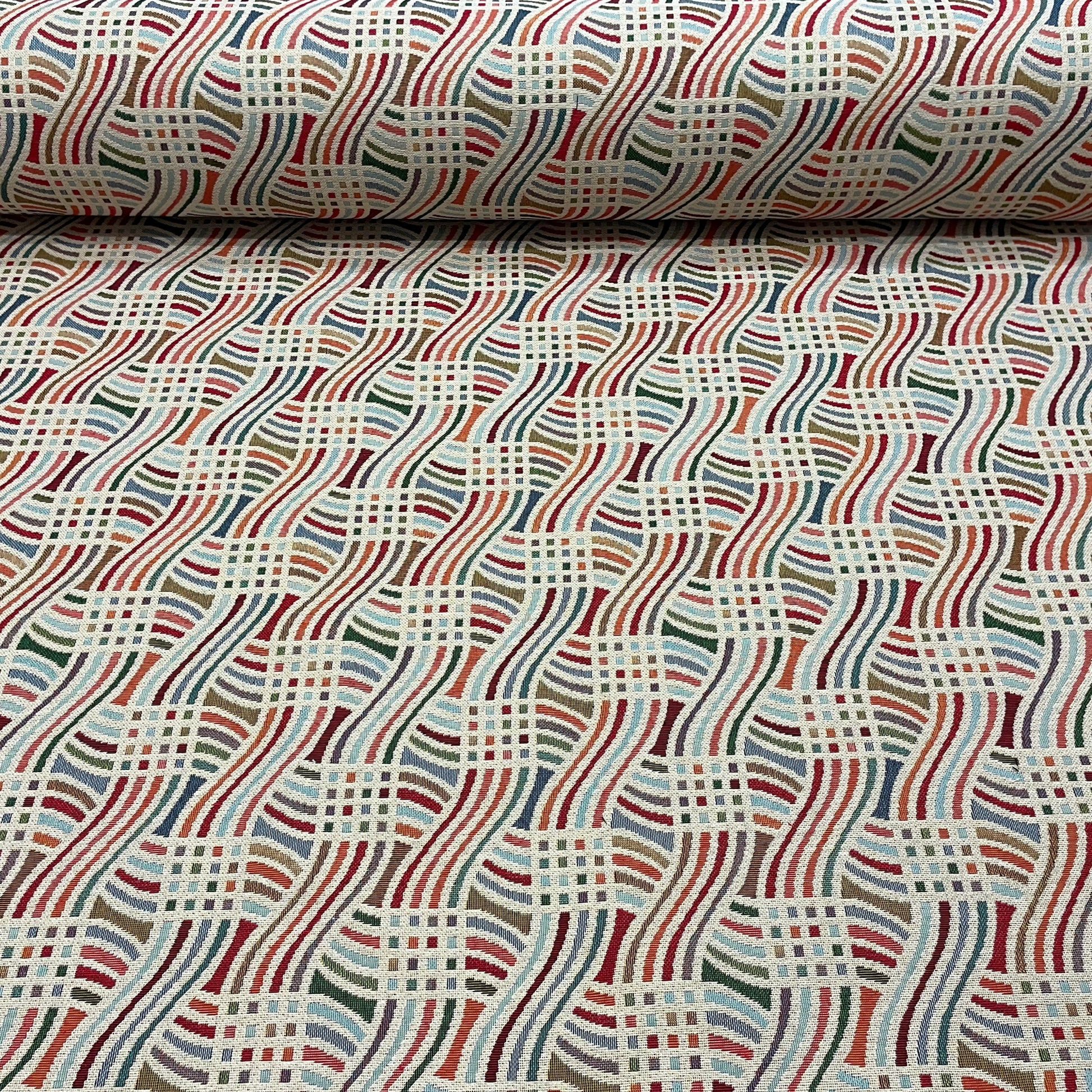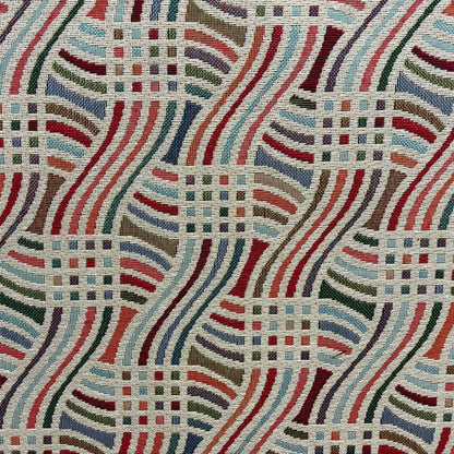 Neutral waves intertwine to create a contemporary geometric pattern for our Retro Wave jacquard weave fabric, blocks of bold colour give an extra dynamic to this truly stunning fabric. Fun and eye catching it would suit contemporary schemes and would be a real feature in any room space.