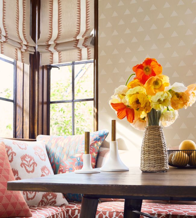 Ridge is a geometric wallpaper by Thibaut. The repetitive triangles create rhythm in an elegant two-tone palette.