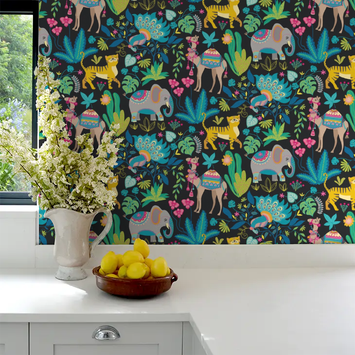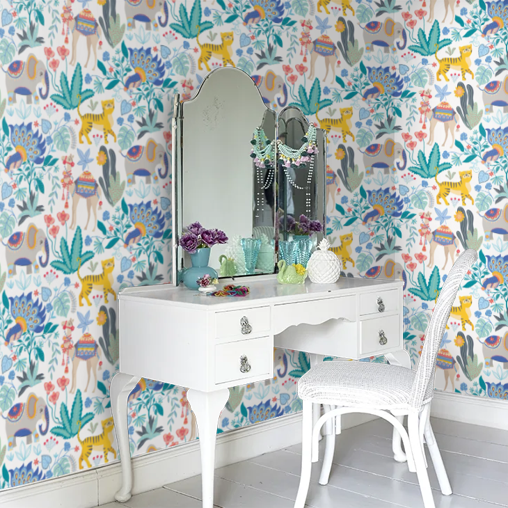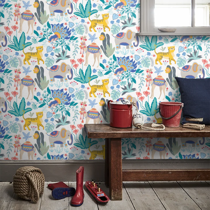 With her head held high, an elegant tiger strides across this colourful kingdom. Nearby, friendly elephants and cheeky camels explore the lush, tropical leaves of their jungle home. Perching high, a peacock tailed bird chitters and chatters, sharing the day’s events from this safari world!