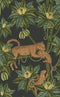 This peaceful design includes fans of leaves and curving trunks and vines, all richly ornamented with precise stripes and scallops. The leopards' fur has a more untamed pattern, in tawny orange, soft metallic gold and bronze, as well as a ghostly mica sheen, as if in a dreamscape.