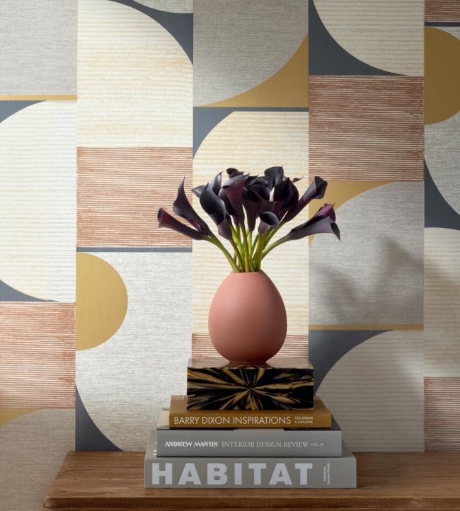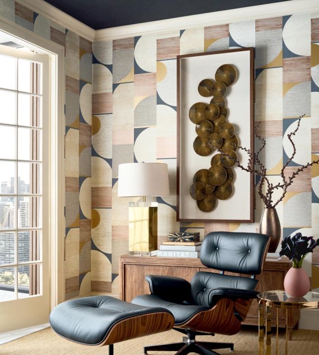 Saturn features a large-scale design of mod circles and squares, reminiscent of a cubist painting with its movement and mosaic nature. Textural line-work and neutral tones soften the retro design, making it more contemporary.