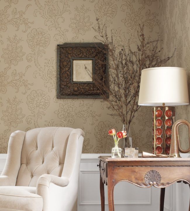 The block print technique of the bold floral in Shapell's sophisticated design climbs the walls with poise and grace.
