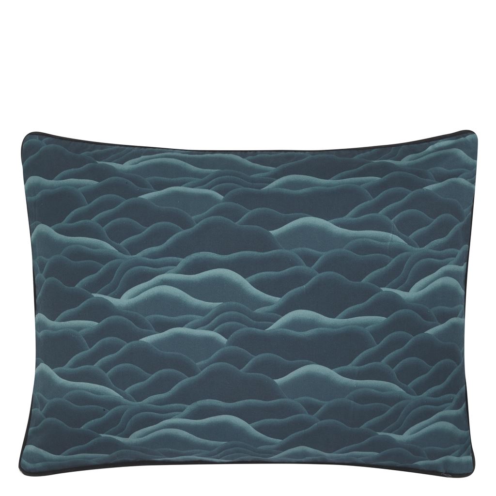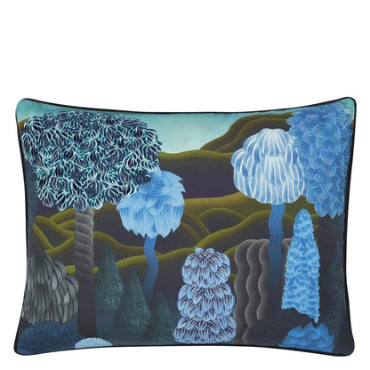 A midnight dream of summer is depicted in this mesmirising cushion by Christian Lacroix. Illustrative trees in shades of blue are set against an undulating forest green ground. Digitally printed onto cotton sateen with embroidered highlights, this designer cushion is completed with a contemporary cloud pattern on the cotton reverse. All our cushions come with a luxurious feather pad.