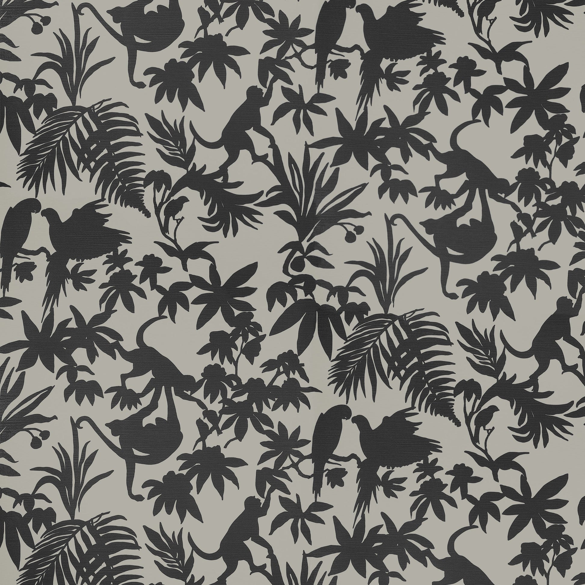 Immerse your walls in a playful animal parade with St. Kitts, a performance vinyl wallcovering featuring silhouettes of monkeys, parrots, and tropical foliage.