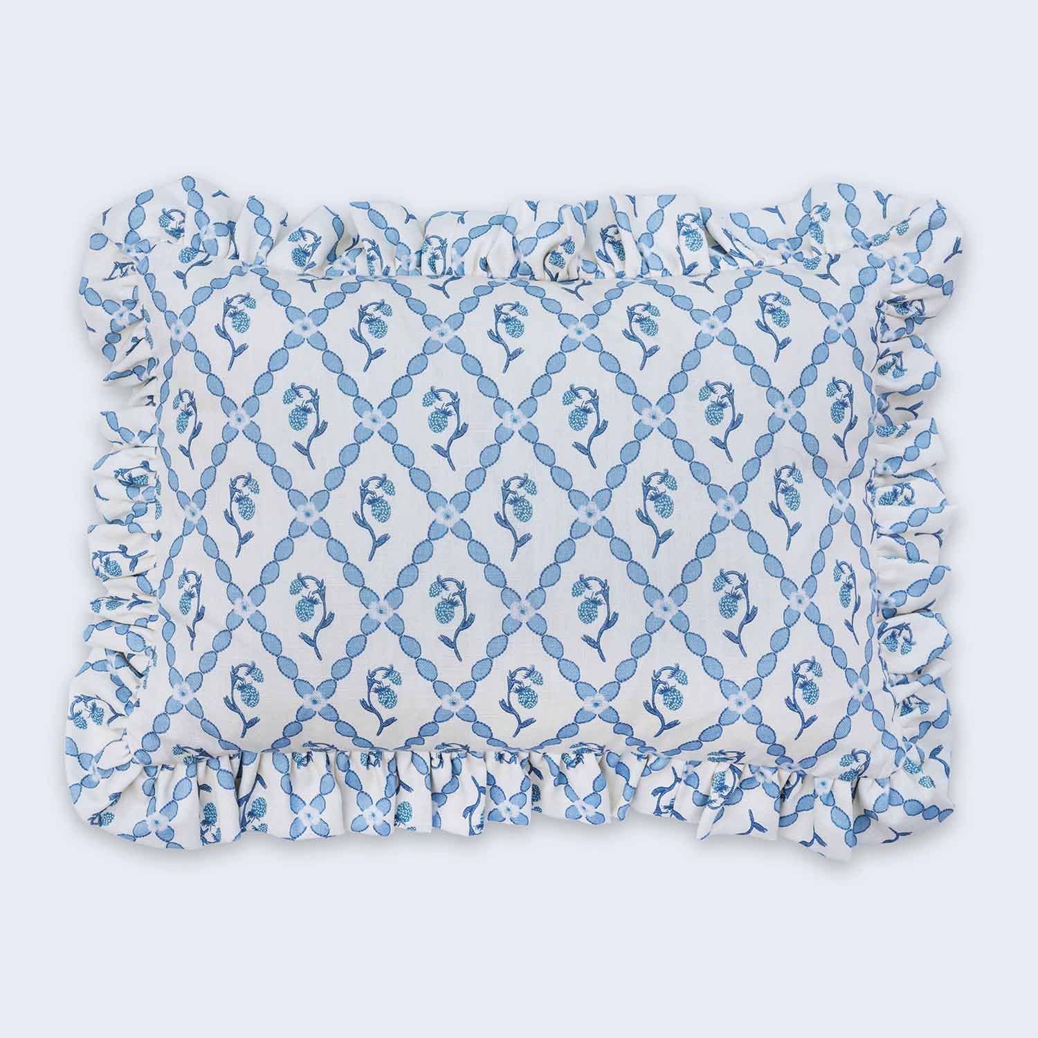 Our pretty Wild Strawberry Trellis cushions have an old-fashioned loveliness and are available in Vintage Cream with a 5cm self-frill and red velvet backing, or in China Blue with a 5cm self-frill and blue velvet reverse. Each cushion comes complete with a feather filler and concealed zip.