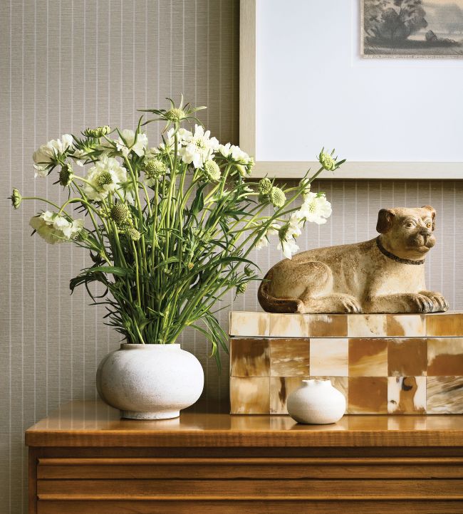 This printed wallcovering is evocative of a fine linen suit. Tailored and masculine, its thin pinstripe sits atop a beautiful background.