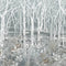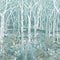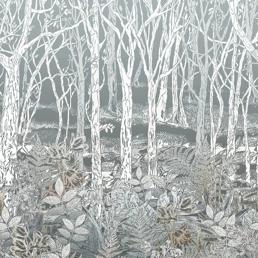 A whimsical woodland scene with a carpet of ferns, bluebells, wild tulips and toadstools is presented as a woodcut mural design with ombre colour throughout the trees, foliage and background.