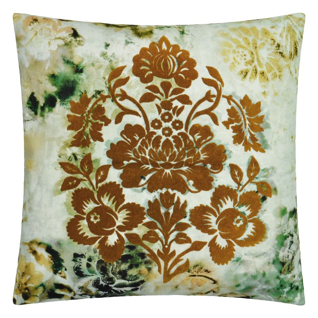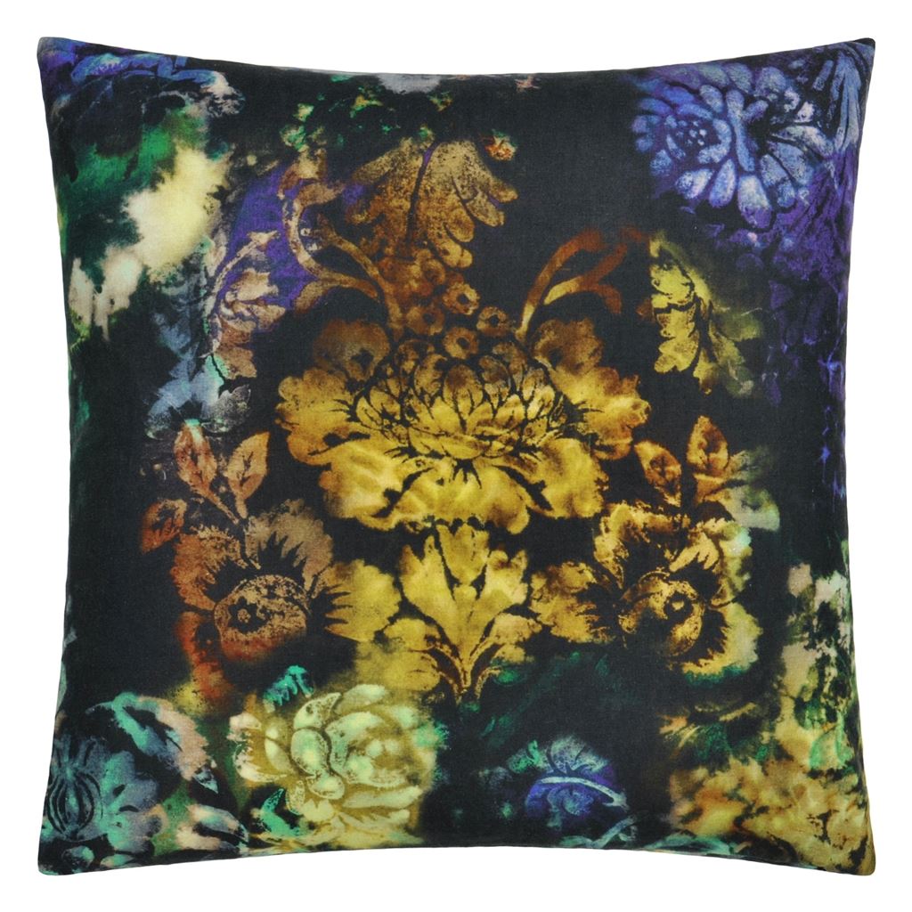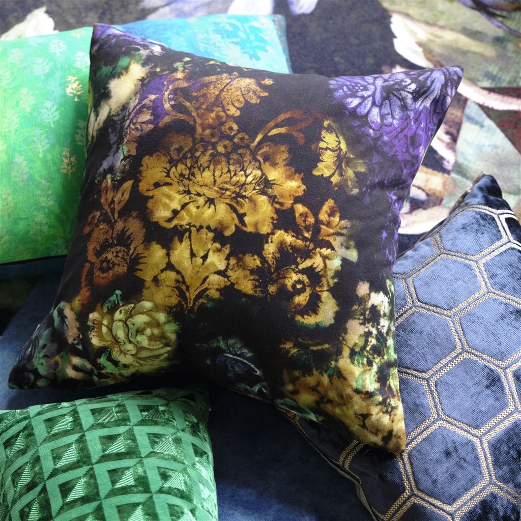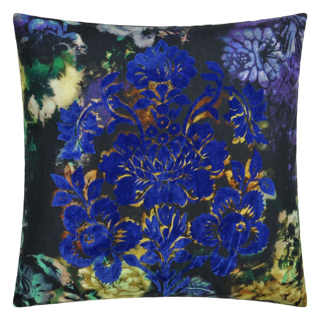A bold damask pattern is flock printed onto a decorative cotton/linen ground in this statement square decorative cushion. In glorious tones of cobalt and indigo blues with highlights of lime to complete your interior scheme. All our cushions come with a luxurious feather pad.