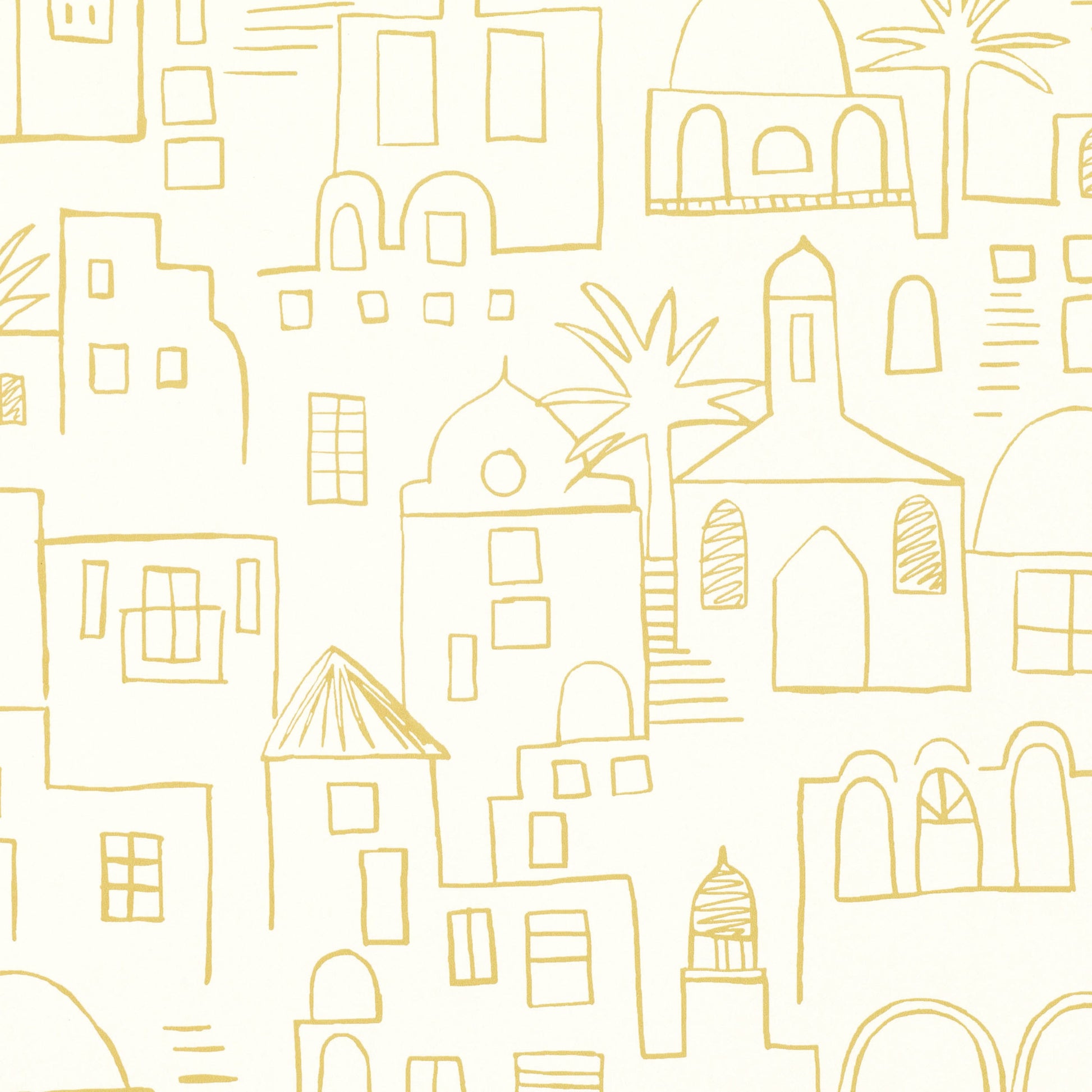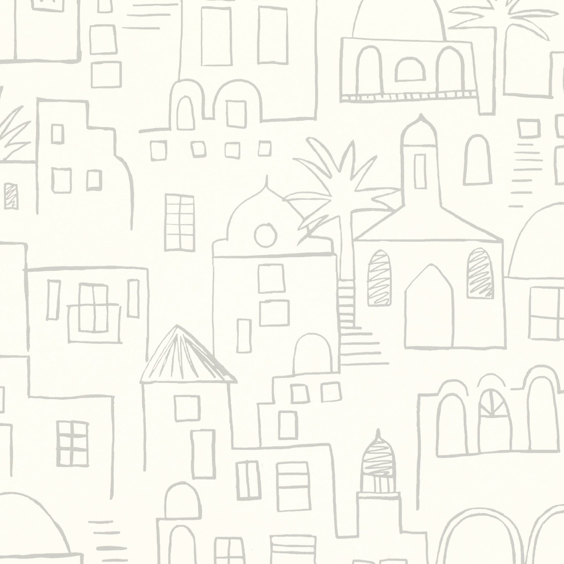 A simply coloured wallcovering featuring an outline of rambling villas and delightful domed churches on a vast hillside in the Mediterranean.