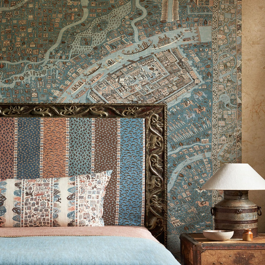 The Map Maxi wallpaper by Lewis & Wood is a captivating design that features large-scale, intricately detailed maps, making it an exceptional choice for those looking to add a sense of adventure and exploration to their bedroom. This wallpaper typically showcases geographic features, landmarks, and various cartographic elements that can spark the imagination and create a unique atmosphere in the space.