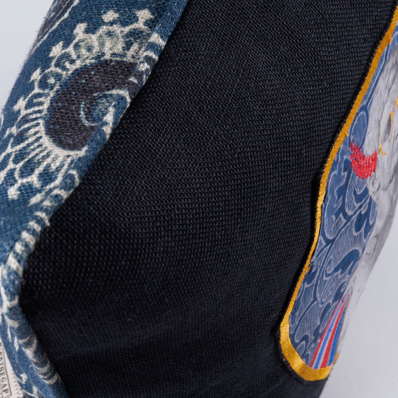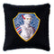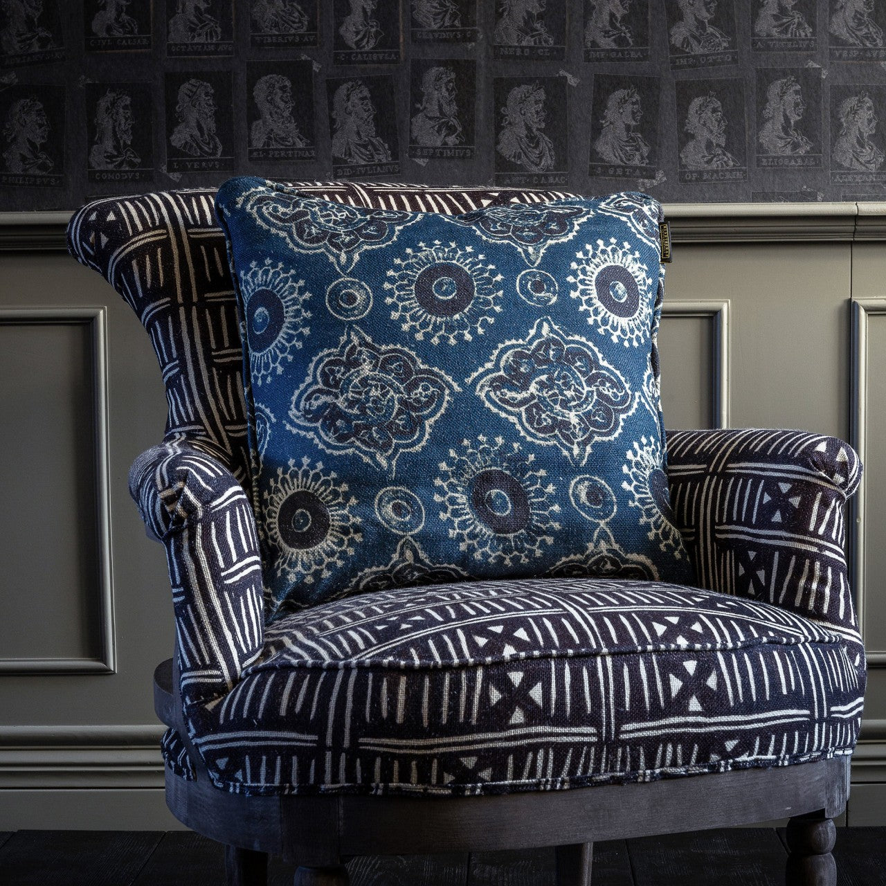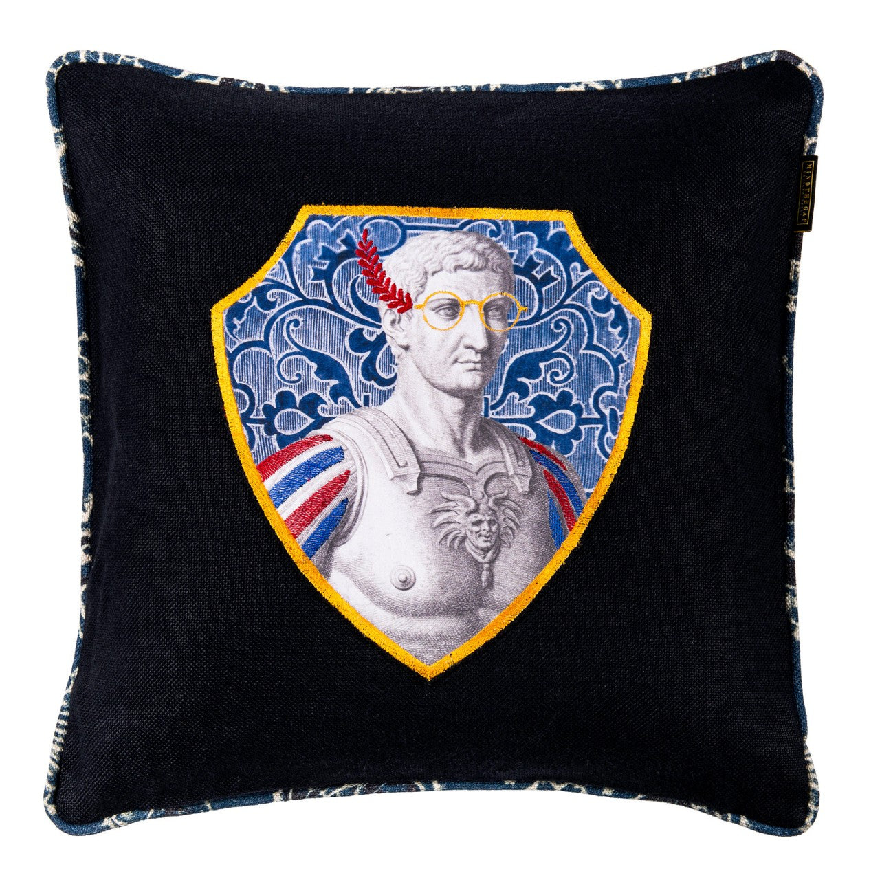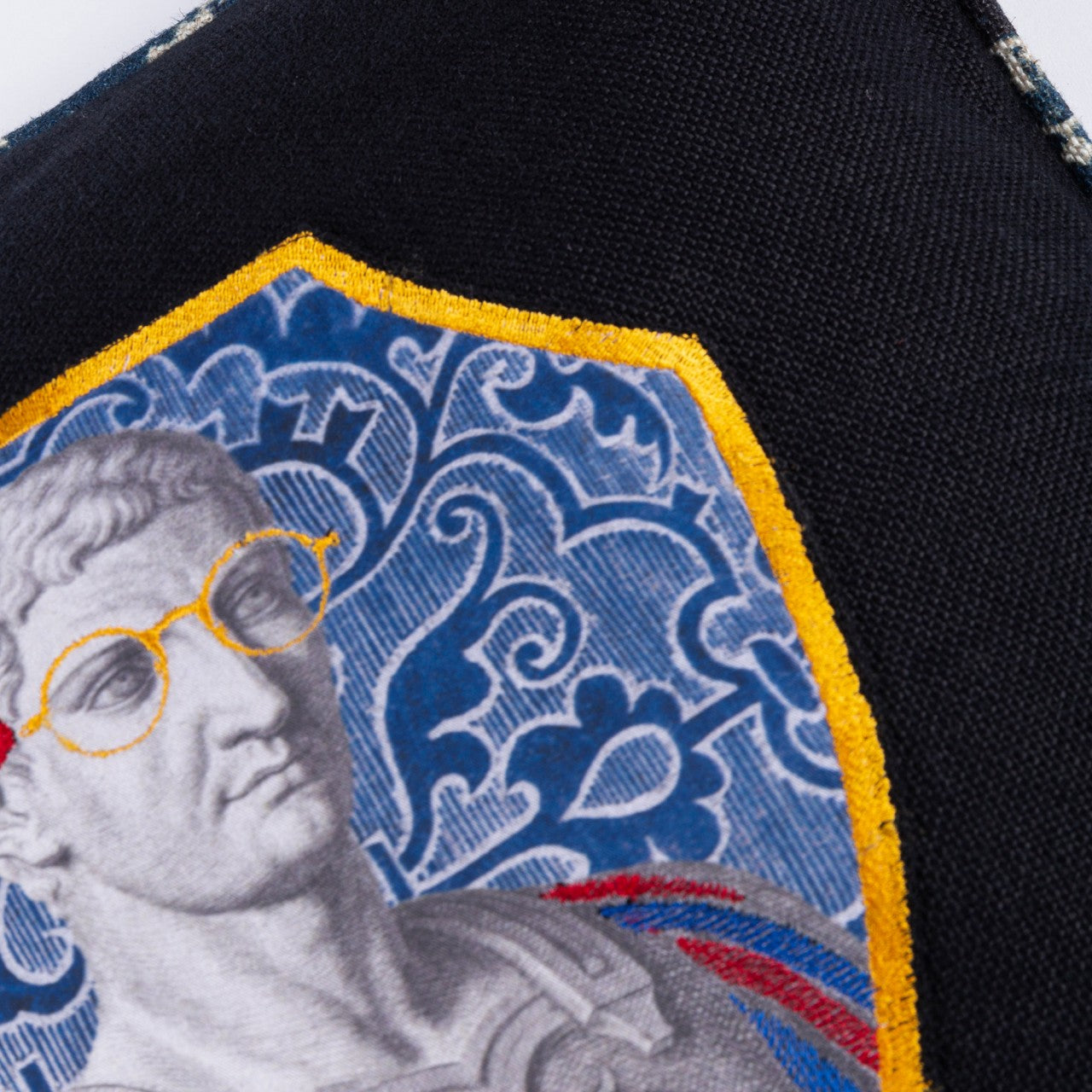 A statement designer cushion with one side made of a printed and embroidered patch with the portrait of Roman emperor Tiberiu and the other side of Ajrakh heavy linen fabric. Filling: Duck feather, Composition: 100% Linen, Finishing: Assorted piping