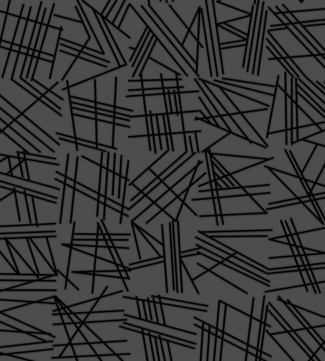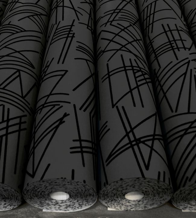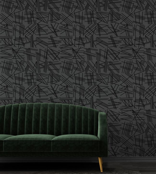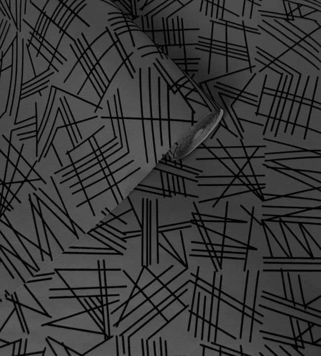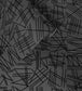 A black flock geometric wallpaper on a heavy weight semi-fibrous dark grey ground.