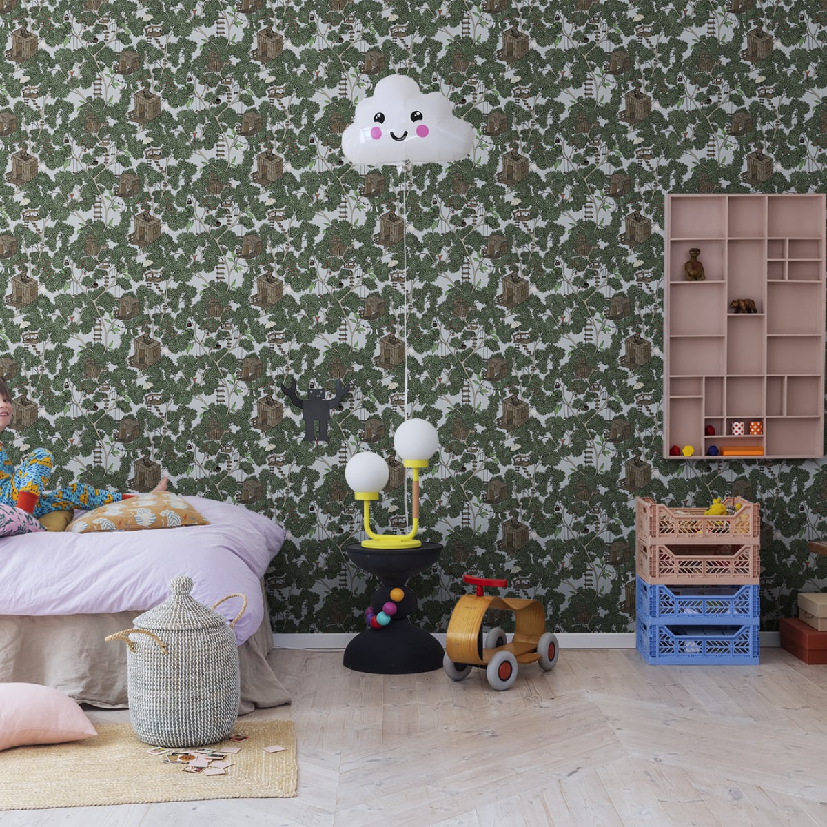The playful wallpaper Treehouse in Graphite is the perfect way to combine a stylish colorway with an imaginative motif. Invite your friends to play!