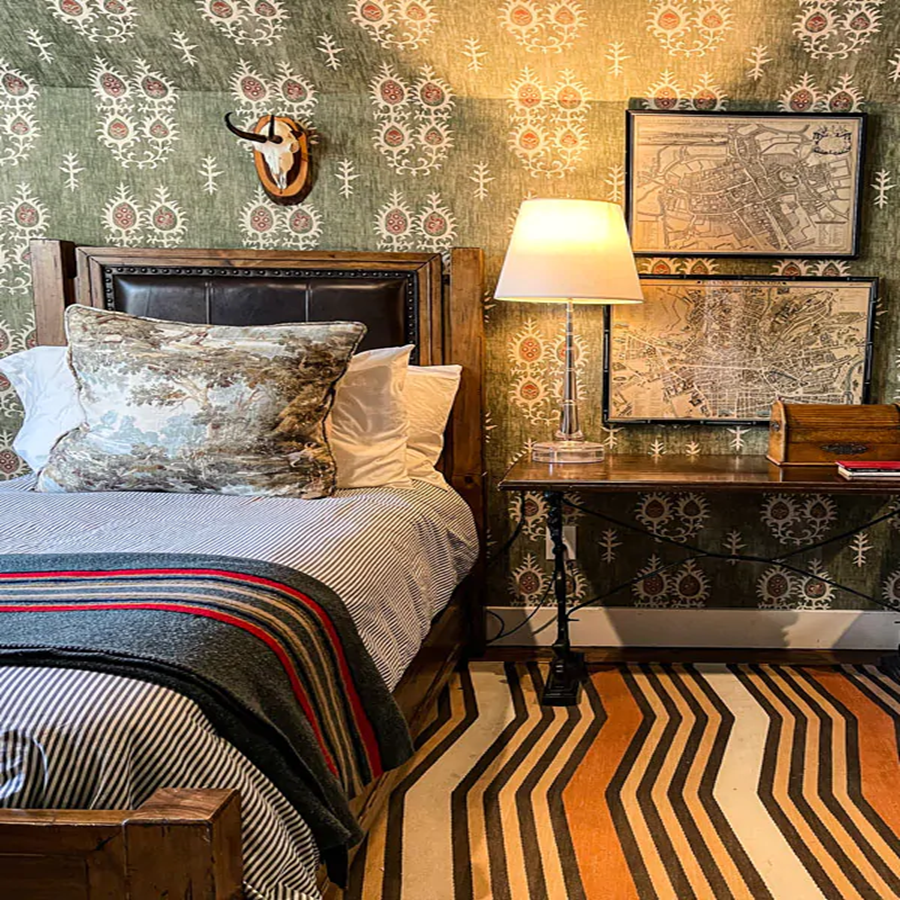 Tribal wallpaper by Lewis & wood can infuse a lounge with a rich and dynamic character, offering a striking visual appeal that captures attention. Featuring bold patterns and textures inspired by indigenous art and cultures, this wallpaper can create an inviting atmosphere that encourages relaxation and conversation. The earthy tones and geometric designs can anchor the space, making it feel both cozy and adventurous. To complement the tribal aesthetic, consider incorporating natural materials, vibrant textiles, and eclectic decor pieces that resonate with the theme, enhancing the overall ambiance.