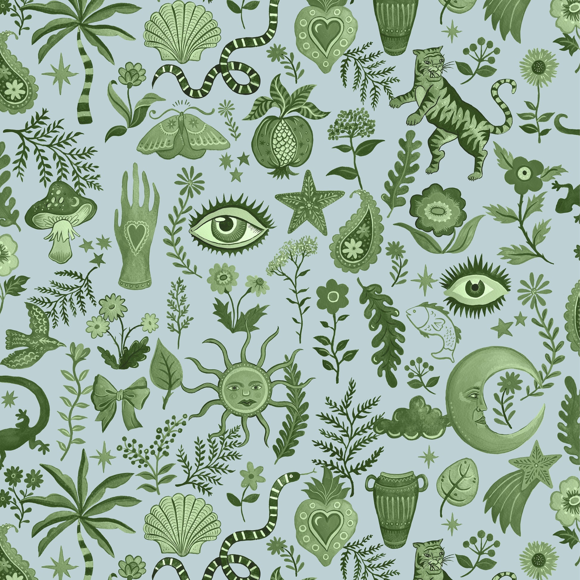 Our design 'Trove' is inspired by the treasure 'trove' of artisan goods found within the Medinas souks. Each symbol we've painted can be found as brass 'Talisman' wall hangings imbued with cultural and spiritual meanings. They are designed to be hung above your front door to ward off evil and negative energys and act as a spiritual safegaurd to the household. Other symbols are used to attract blessings, peace and good fortune.