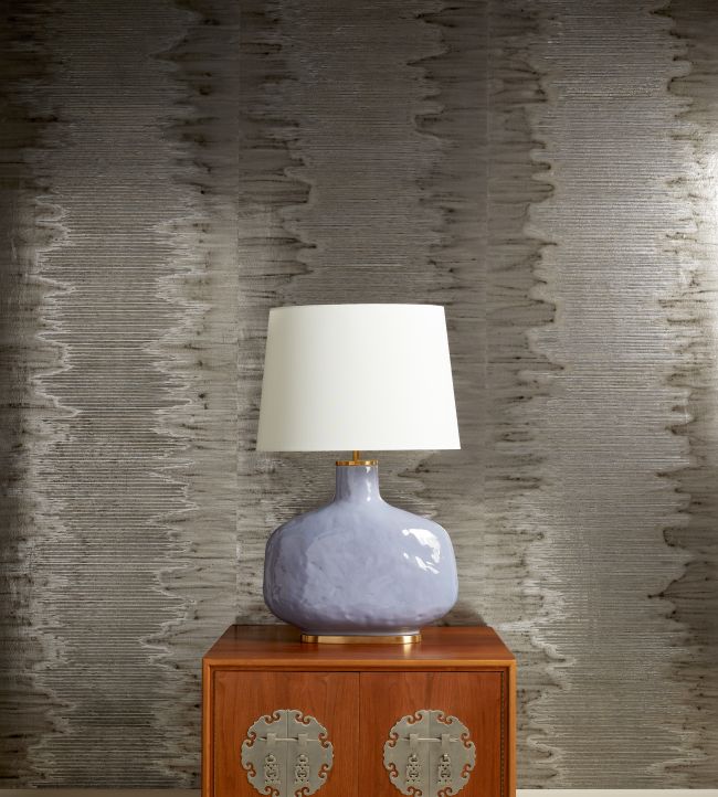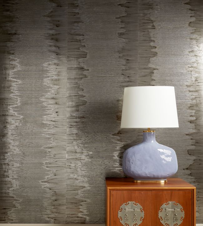 This extra-wide, watery stripe has a dramatic wave-like appearance, set against a hand-combed backdrop. A glossy finish and mirror-like metallic ground create lots of shimmer in a range of colourways that are inspired by pearls, minerals and gemstones.