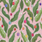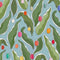 Hand drawn in Ottoline's London studio, the Tulips Festival wallpaper design features a stylized leaf pattern acompanited by small tulips in a regular repeat.