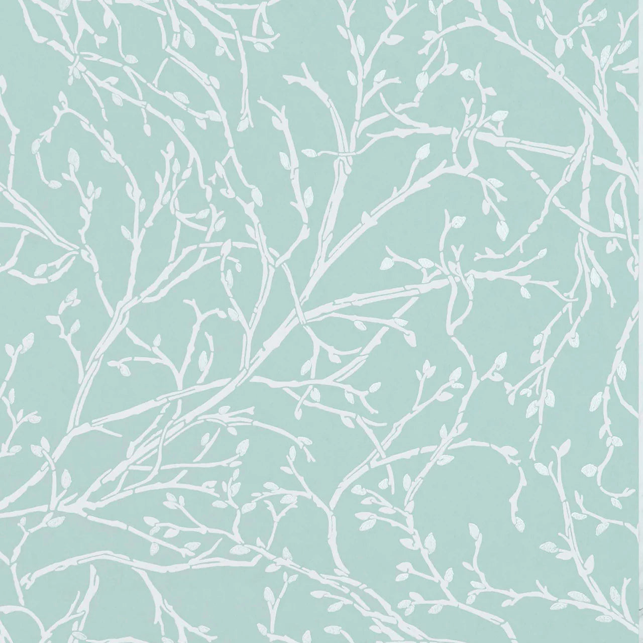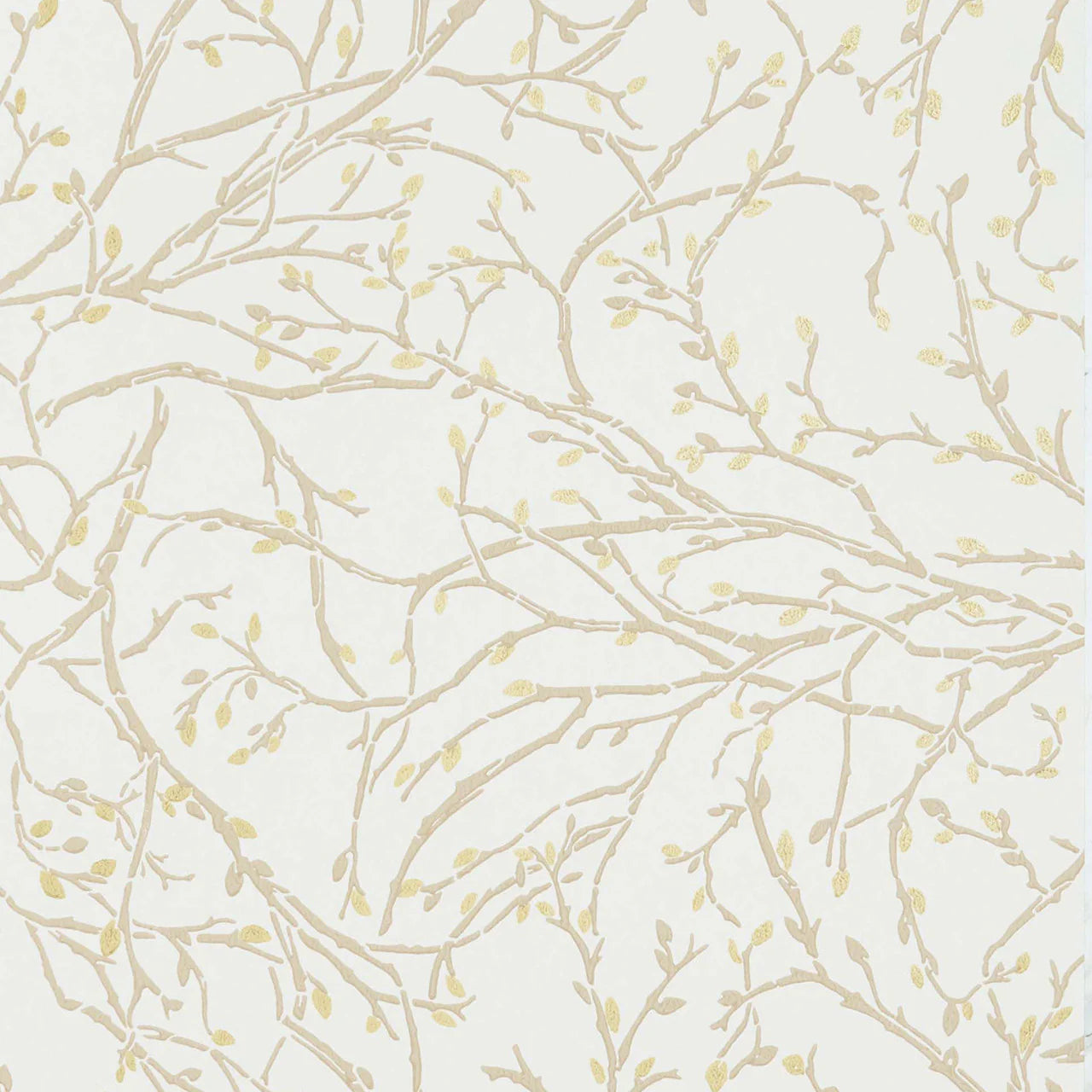 An all-over pattern of painterly twigs with buds picked out with metallic or contrasting colour detail.