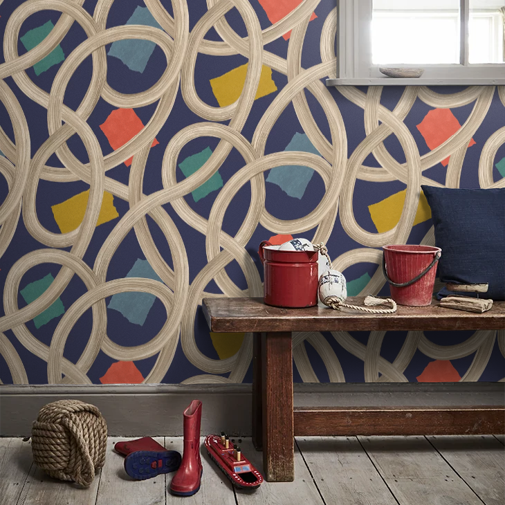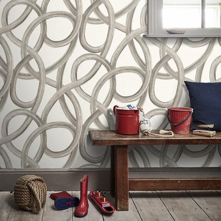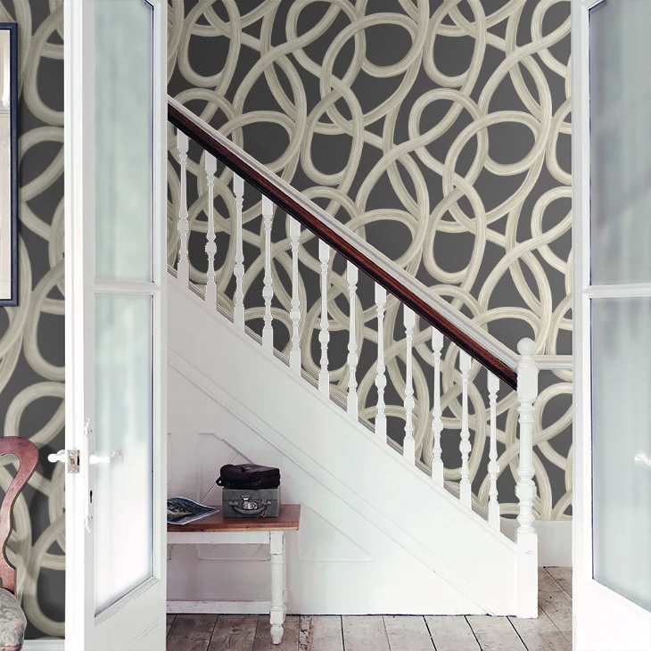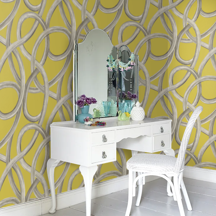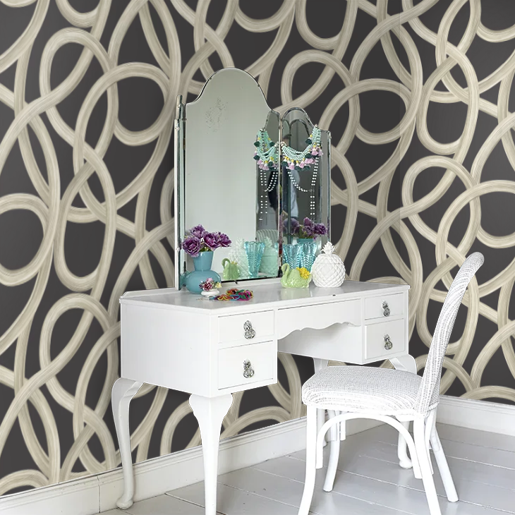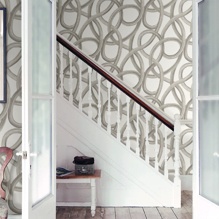 Artistic brush strokes create a curving textural swirl across the surface of your wall. Twisted Geo is composed of abstracted geometric loops and links. A dynamic and fluid pattern with added colour blocks offering depth and dramatic interest.