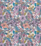 An all over stylised composition of colourful flowers and contrasting striped leaves printed on linen union.
