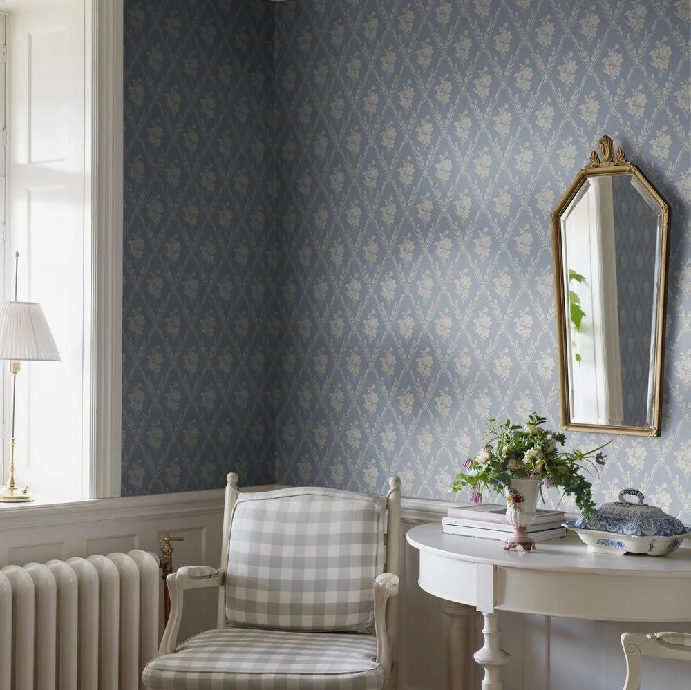 Flowers, leaves and elegant ornamentation create a harmonious repetitive rhythm across the walls.