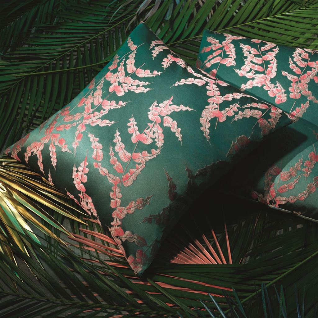 A contemporary damask print imagined via undulating fronds of seaweed. This incredible jacquard woven design from Christian Lacroix Maison can be used for curtains and cushions. In two stunning colourways. Composition: 57% Viscose 25% Polyester, 18% Acrylic.
