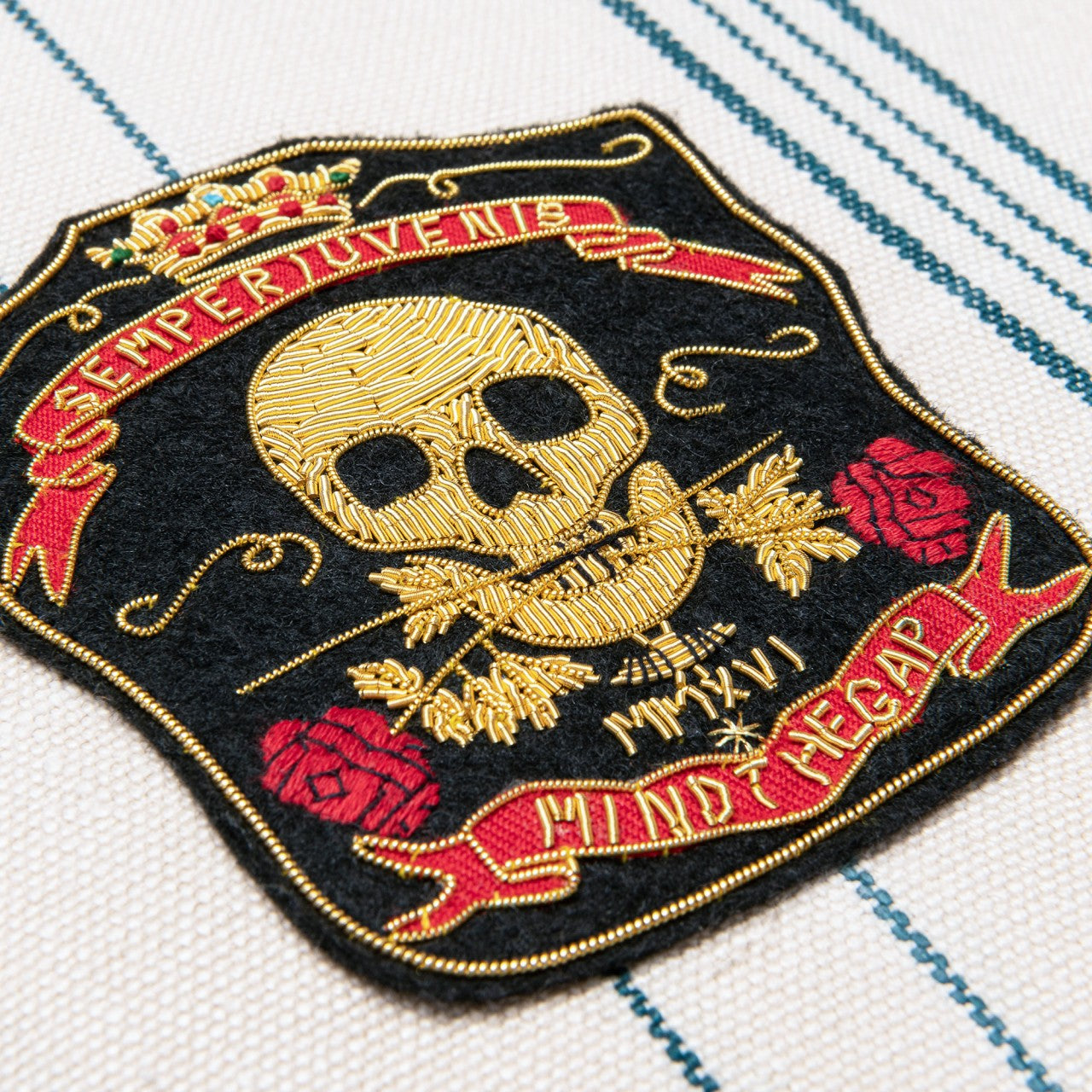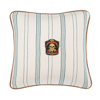 The stonewashed blue stripes set against a neutral background refer to the fashions of the 1960s and 70s. Its raw aesthetic and texture reference the spirit of the movement itself, with the era witnessing an ardent passion for freedom and peace across the world. The WICHITA STRIPES cushion is finished with a brown leather piped edge and the front cover is decorated with a beautiful hand-embroidered metallic bullion displaying a skull and two roses representing the main symbol of the Woodstock Collection, Semper Iuvenis. Composition: 100% natural linen, stonewashed woven fabric, Finishing: Leather piped edge