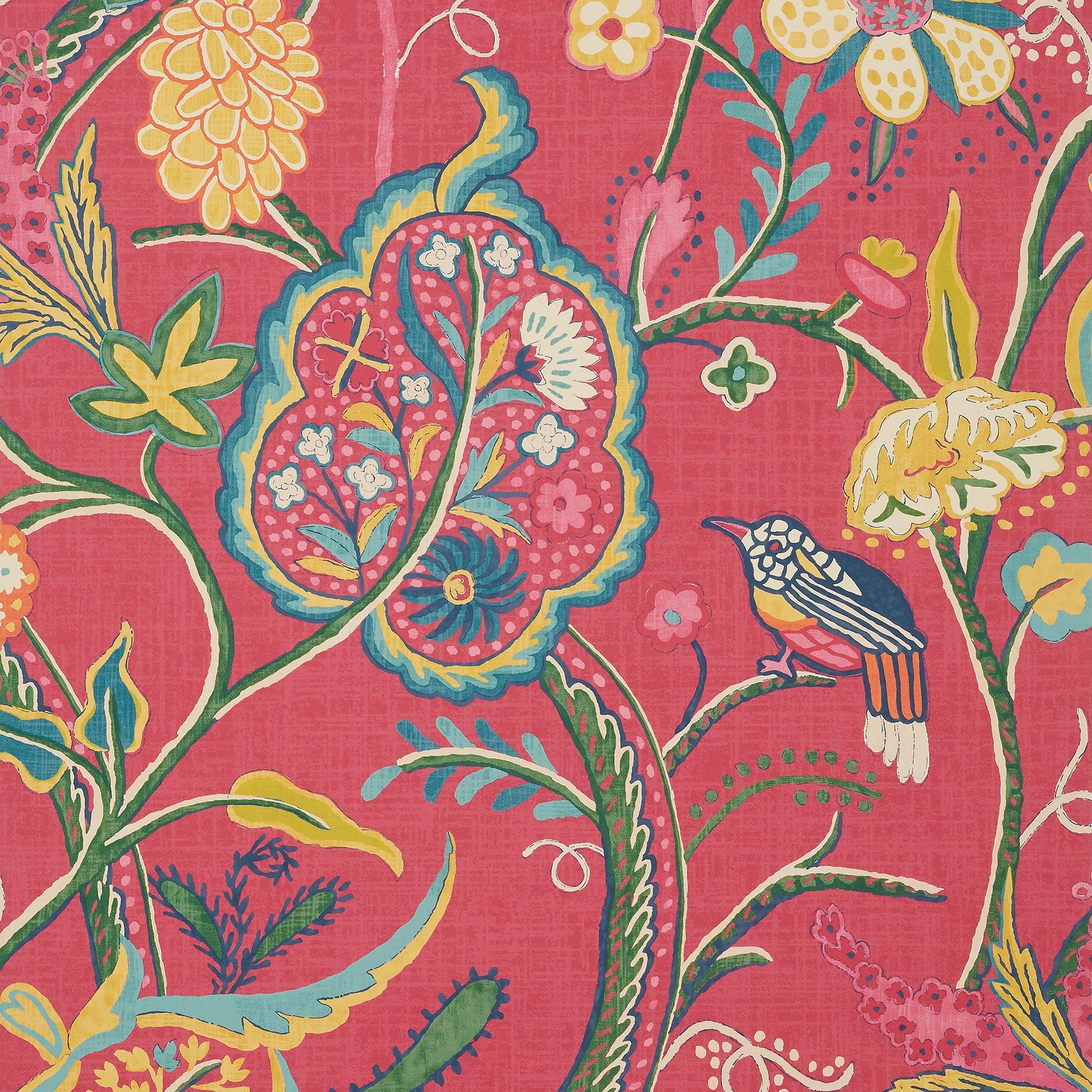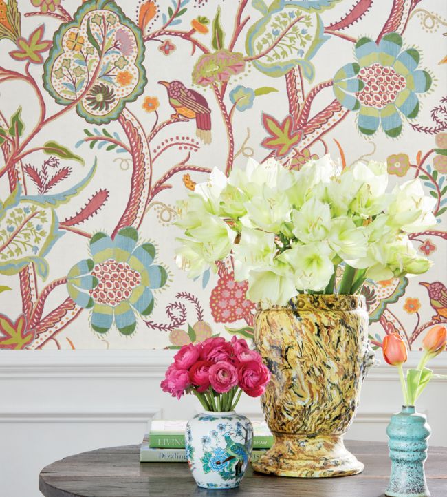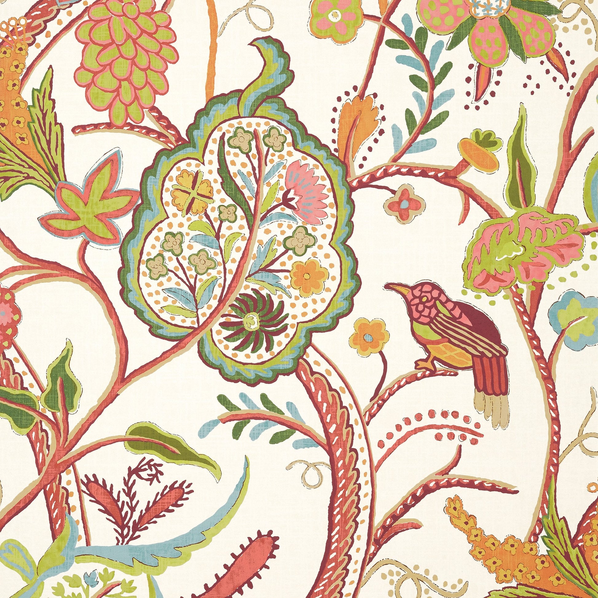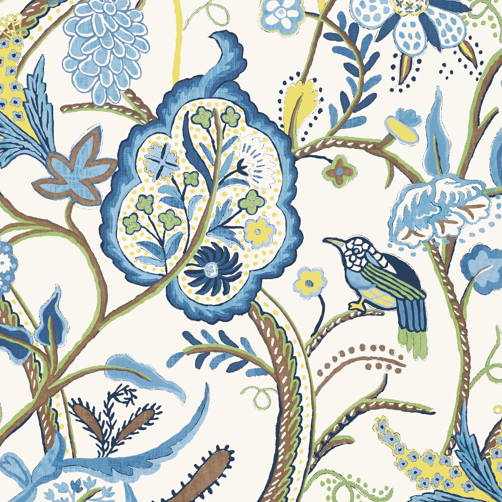 Elevate your walls with the Windsor Wallpaper from the Canopy Wallpaper Collection by Thibaut. This quintessential tree of life pattern draws inspiration from an antique, wool crewel fabric. Windsor features large fanciful Jacobean blooms, adorned with whimsical touches like a chickadee, creating a charming and timeless design.