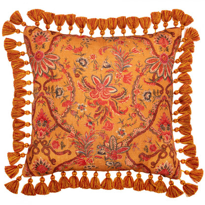 Encapsulating the ambience of the festival entirely, this vivacious design creates a showstopping statement with its swirling floral forms and bold colour palette. Referencing the fashions of the era, the popular psychedelic prints, and the birth of ‘flower power’, the WOODSTOCK cushion conveys the sense of freedom and courage which many witnessed at the festival itself. Decorated with matching cotton tassels that reminds of the old style Hindu cushions. Composition: 100% natural linen, stonewashed printed fabric, Finishing: Matching tassels all around the cushion