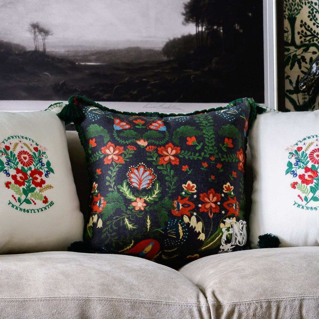 The intricate pattern featuring milfoil, bluebells and various Carpathian wildflowers make for a full and bountiful linen cushion. Decorated with a beautiful M monogram on the back, this cushion is hand-finished with Hand-finished with green scallop crochet trimming and green cotton tassels. Coming with 100% duck feathers filling. Composition: 100% Linen