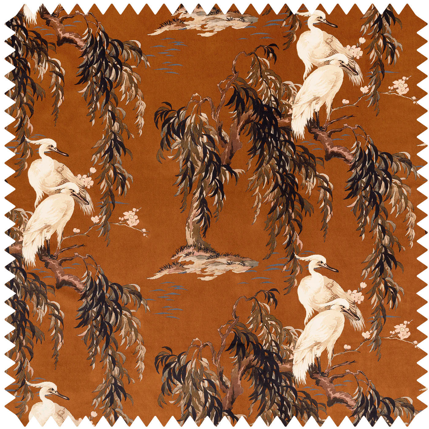 Depicting a peaceful lakeside scene with elegant cranes and majestic weeping willow trees, 'Zeus' is an enchanting work of art. Printed onto smooth British velvet, it's an exquisite choice for your soft furnishing and upholstery projects and will give them a truly unique finish.
