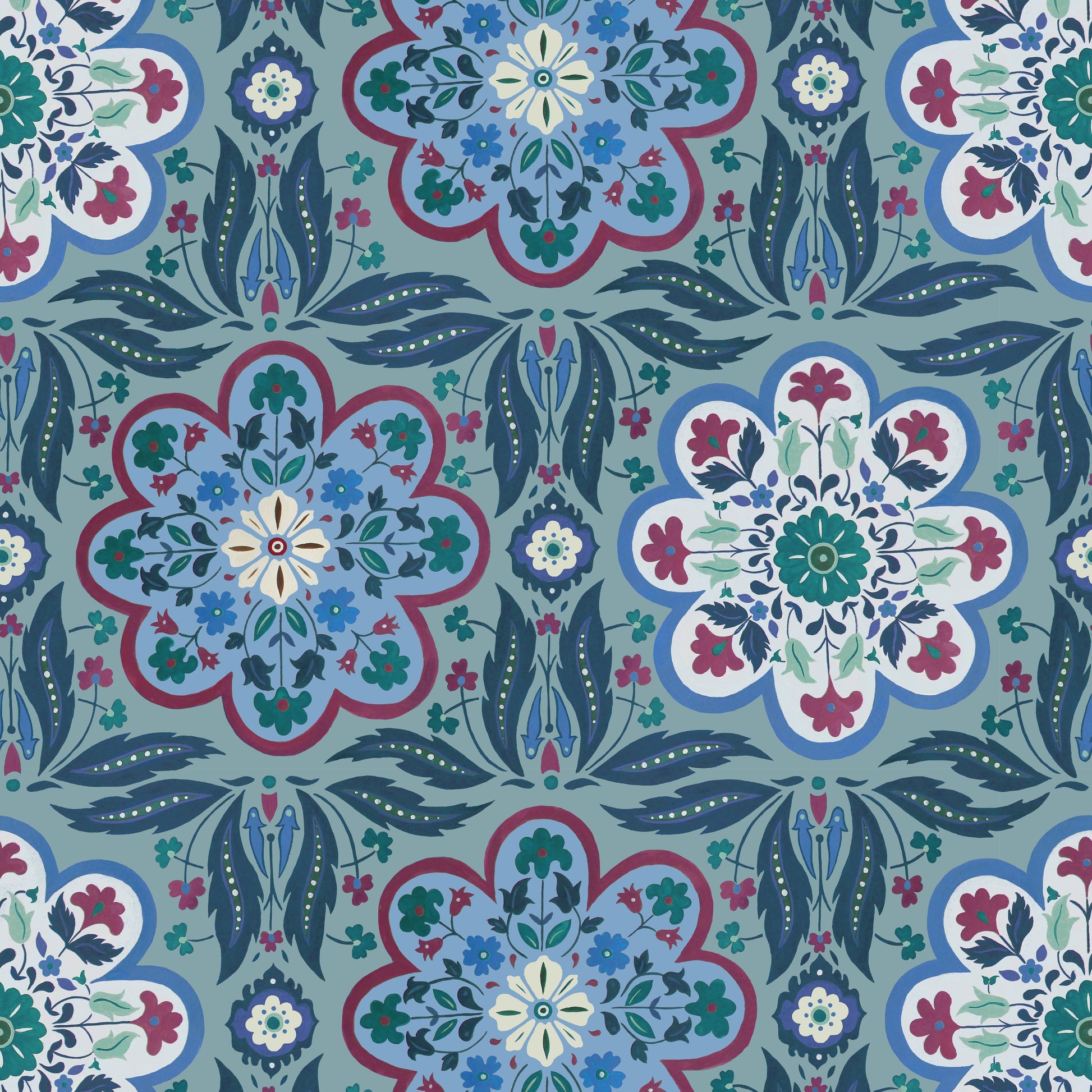 Our Zouak Wallpaper in is a gorgeous geometric style print inspired by the beautiful painted ceilings of the Bahia Palace in Morocco. Our print pays homage to the craftmanship and skill of zouak, the name given to the traditional art of decorative wood painting. The compositions would emphasise symmetry and repetition giving a sense of depth and grandeur. Coloured in the earthy natural tones of polished stone conveying elegance and timelessness.